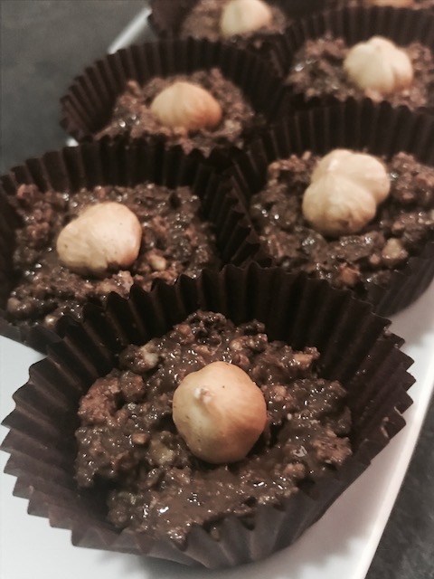 *Amb ajut de dues culleres formeu boles i les poseu en un motlle de mini-magdalenes, decoreu amb una avellana cada una i deixeu refredar, una hora aprox, a la nevera.