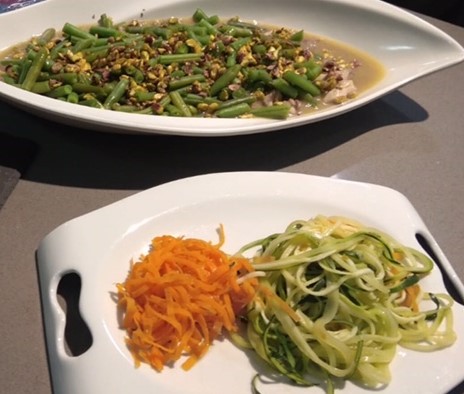 JUDIAS VERDES AL VAPOR CON POLLO EN SALSA DE PISTACHOS Y ESPAGUETIS DE VERDURAS CON THERMOMIX LLEIDA
