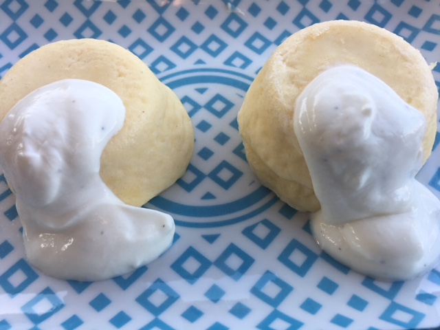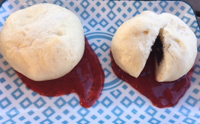 (1) Empezaremos con unos Bollitos al Vapor con centro de chocolate y salsa de cerezas, que hemos cambiado por fresas.