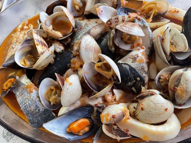 4. Retire el Varoma. Con la muesca de la espátula, extraiga el cestillo y reserve. Triture la salsa 12 seg/vel 7. Coloque la dorada en una cazuela de barro y añada las patatas y los mejillones. Bañe con la salsa, espolvoree con el perejil picado y sirva.