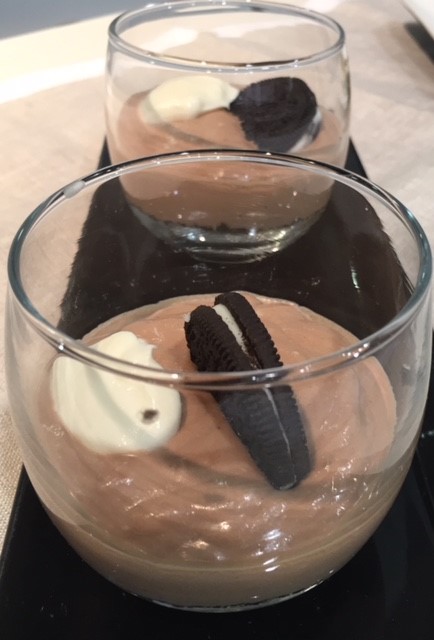 Añadimos al resto de la nata, el cacao puro, el queso, la crema de cacao y avellanas, la vainilla y el brandy. Mezclamos 30 segundos/velocidad 4. Distribuimos la crema en los vasos reservados y decoramos con la nata montada reservada y las 2 galletas restantes. Dejamos en la nevera una hora.